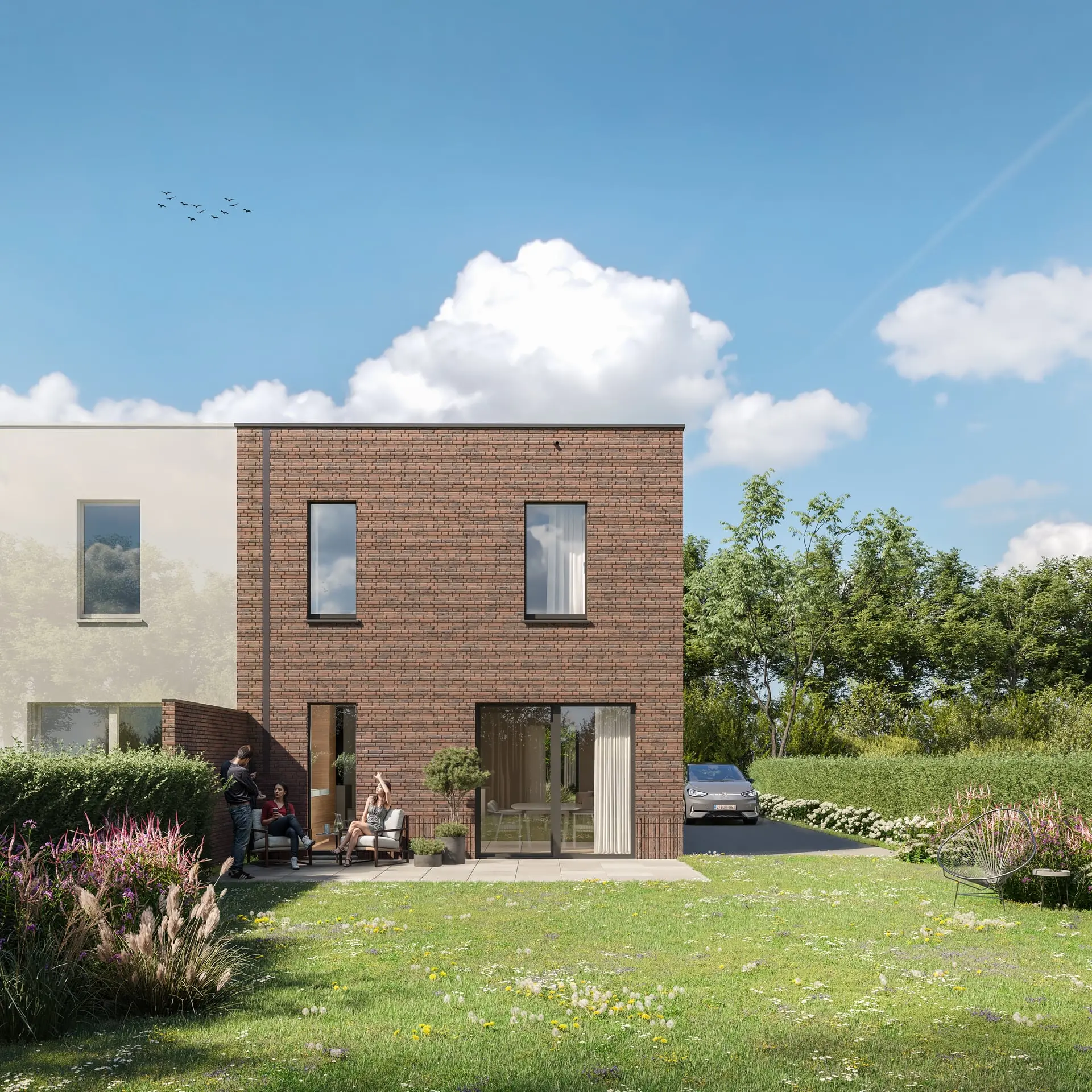 Via de inkomhal stapt u meteen in een zee van licht met aansluitend een ruime open leefruimte. Achteraan bevindt zich het hart van het huis: de open keuken met eiland, direct verbonden met de tuin via een groot schuifraam. Praktisch detail: de ruime berging loopt slim door onder de trap, zodat elke centimeter benut is.